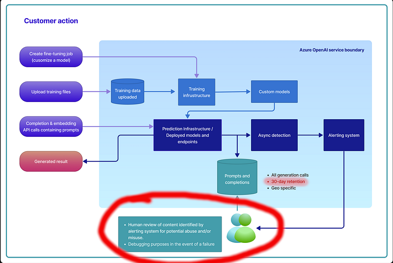 Une étude plus attentive des conditions de privacy d’Azure OpenAI Services révèlent un curieux dispositif de rétention de données sur une période de 30 jours, couplé à un droit que se réserve Microsoft d’inspecter ces données au cas où on y trouverait des contenus illicites ou à des fins de debugging.
